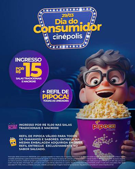 “A promoção Mês do Consumidor reforça nosso compromisso em ampliar o acesso ao cinema de qualidade com condições diferenciadas. Com esta promoção, convidamos o público a aproveitar toda a experiência das nossas salas tradicionais e MacroXE, unindo tecnologia, conforto e refil da clássica pipoca de cinema para assistir aos grandes lançamentos da melhor forma”, afirma Luiz Fernando Angi, gerente de Marketing da Cinépolis no Brasil.