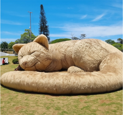 A obra “Círculo de Paz” é uma instalação artística que combina arte, design urbano e afeto em um gesto simples: criar um espaço de acolhimento coletivo inspirado na forma de um gato em repouso. A escultura representa um enorme gato adormecido, transformado em mobiliário público lúdico, que convida o público a interagir e relaxar em sua estrutura macia como um gato felpudo.