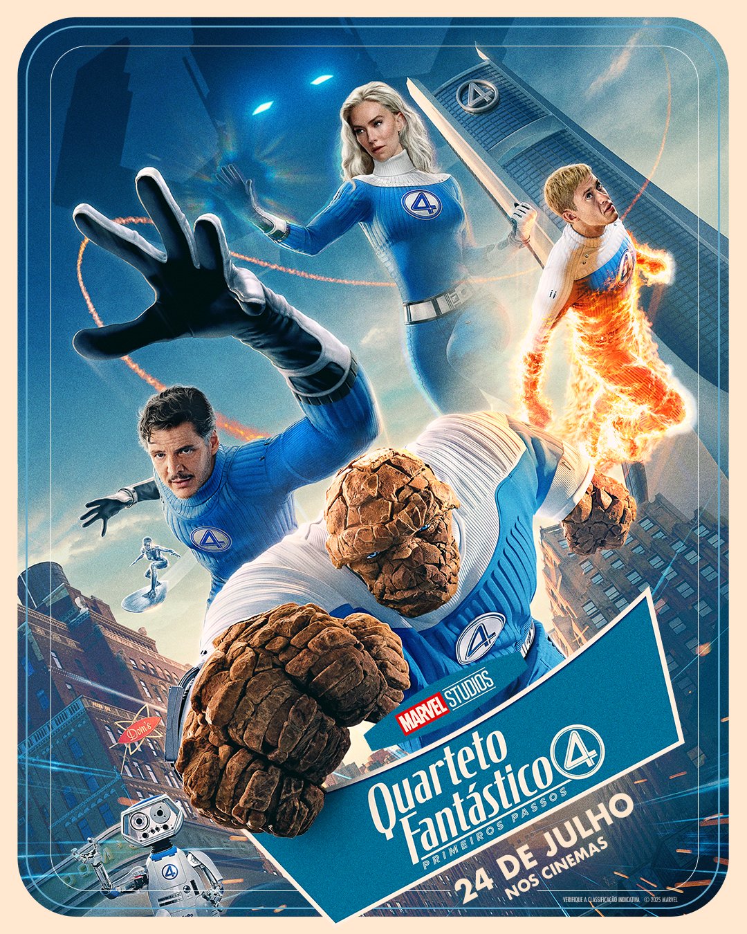 Essa também é uma das maiores forças do longa dirigido por Matt Shakman, que já havia entregado um brilhante resultado em “WandaVision”. A ambientação dessa Nova York alternativa, baseada em uma estética retro futurista – que mescla elementos dos cidadãos comuns a outros que fazem parte da rotina dos heróis, como o automóvel voador “Fantasticarro” e o adorável robozinho H.E.R.B.I.E. (voz de Matthew Wood) – é de encher os olhos.