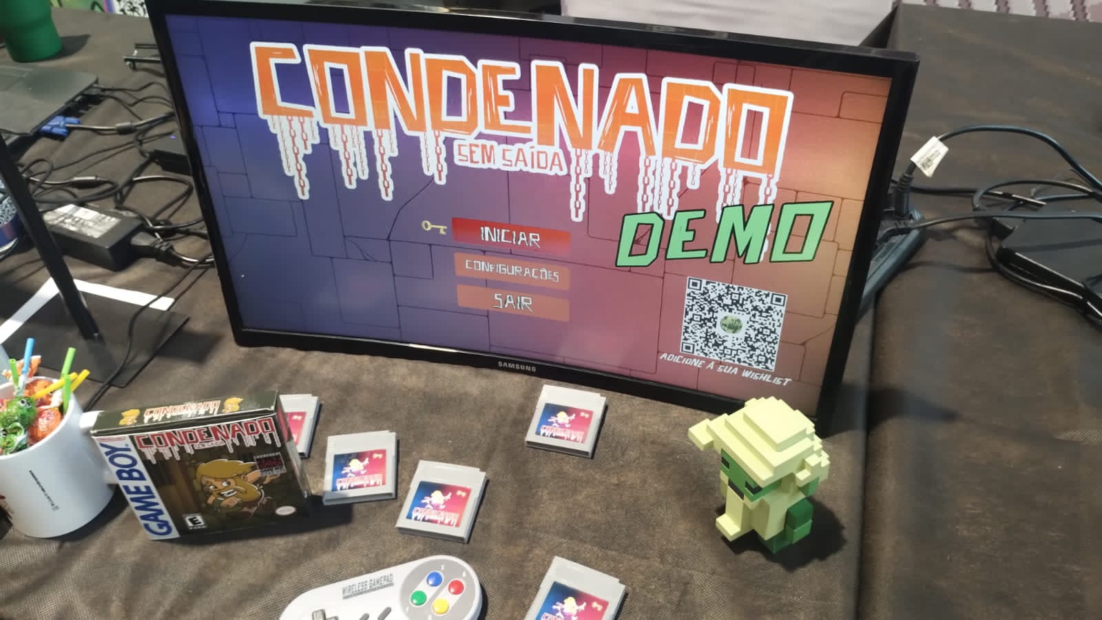 Quando cheguei, logo fui para a área indie, afinal sou grande fã de jogos independentes, além dos antigos, claro. O mais legal é que vários títulos eram para consoles antigos e me surpreenderam os criadores: além de disponibilizarem e comercializarem as roms (arquivos para emulação) de seus jogos, a maioria apresentava mídia física na forma de cartuchos para os mais diversos consoles como o Atari 2600, Master System, Mega Drive e Game Boy.