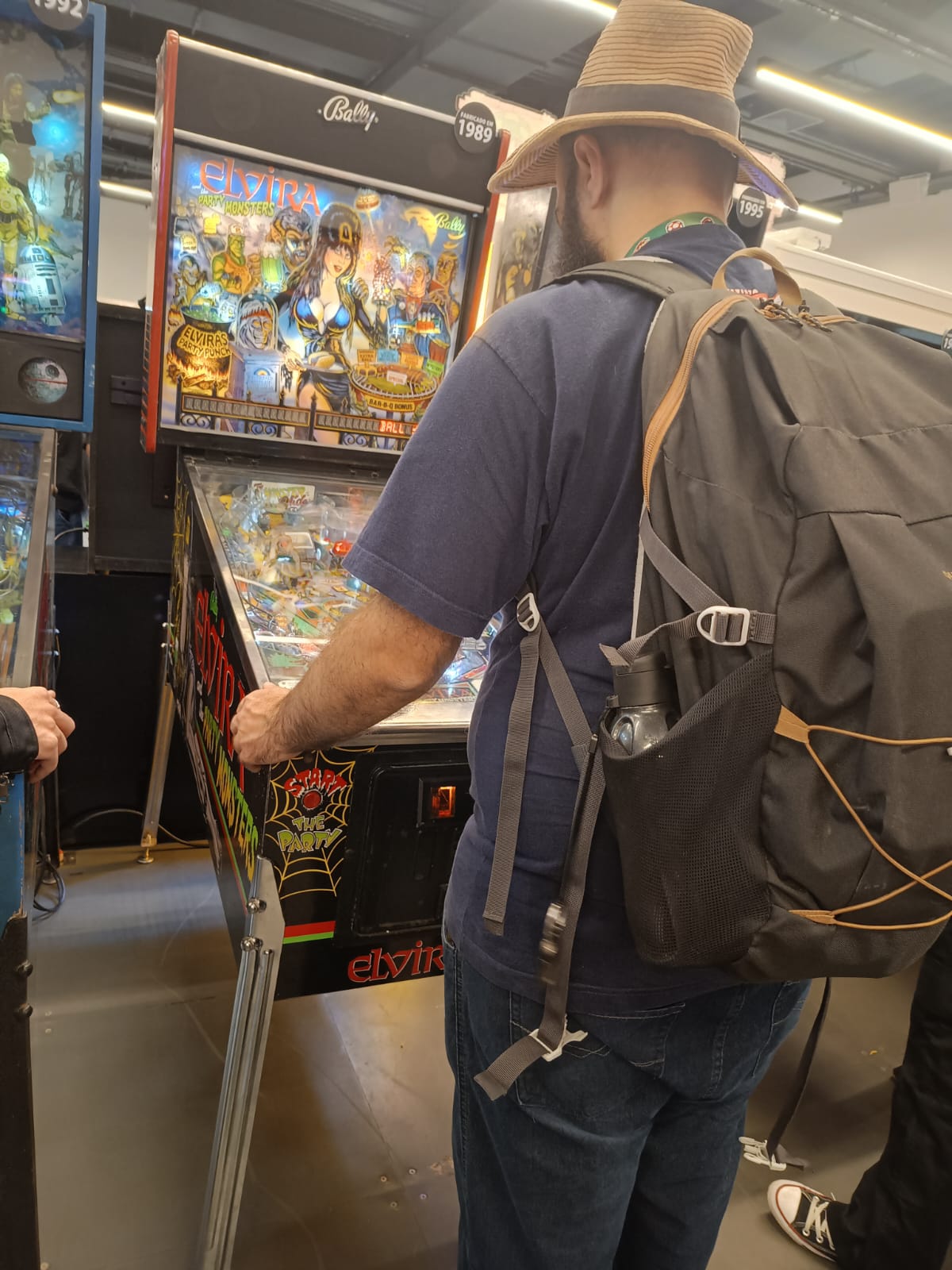 Além disso, foram disponibilizadas oito máquinas de pinball, que mesmo sendo em um espaço mais singelo do que em outras convenções, contava com peças mais raras e/ou antigas dos que se encontravam por aí mesmo quando essas ainda eram presentes. Destaque para três: uma do começo de 1973, que me emocionei ao jogar; uma posterior, do final da década de 1970; e uma da personagem Elvira – A Rainha das Trevas, dos anos 1980. Nunca vi esse modelos em outros eventos, ou mesmo em fliperamas durante minha infância.