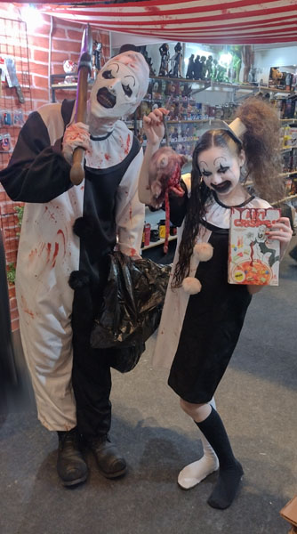 Assim como há estandes na área de expositores, com algumas opções para quem não perde o apetite, mesmo quando figuras cobertas de sangue falso circulam ao seu lado.