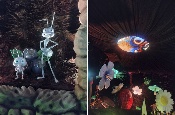 O percurso já começa trabalhando lindamente com a perspectiva que nos dá a impressão de termos nos transformado em pequenas formigas e agora fazer parte de “Vida de Inseto”. No formigueiro recriado nessa primeira sala, é possível encontrar Flik e Dot.