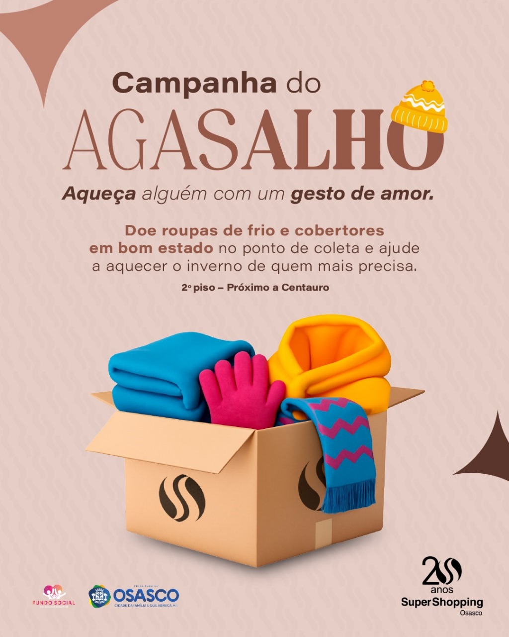 Como parte de seu compromisso com a comunidade, o SuperShopping Osasco também realiza a Campanha do Agasalho, incentivando os clientes a doarem roupas em bom estado, como casacos, meias, calças e mantas. As doações podem ser entregues nos pontos de coleta localizados no Lounge (2º Piso, ao lado da Centauro) até o dia 15 de julho.