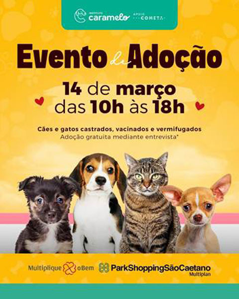 No próximo sábado, 14 de março, o ParkShopping São Caetano promove um evento de adoção de cães e gatos em parceria com o Instituto Caramelo, organização reconhecida pelo trabalho de resgate, cuidado e reinserção de animais em situação de vulnerabilidade. A ação acontece das 10h às 18h, no Piso L2 (Piso São Paulo), ao lado da loja Havaianas.