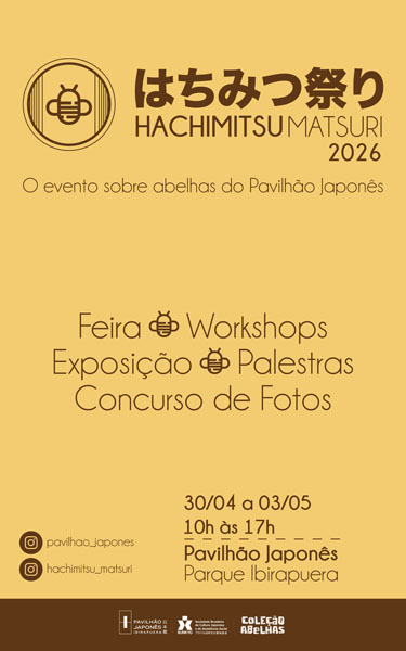 Recém-reformado, o Pavilhão Japonês do Parque do Ibirapuera, em parceria com o Coleção Abelhas, realiza a 5a edição do Hachimitsu Matsuri, com bazar, atividades, exposição de fotos, palestras, workshops e convidados especiais. Em japonês, “hachimitsu” significa mel de abelha, e “matsuri”, festival. O evento acontece nos dias 30 de Abril, 1º, 02 e 03 de Maio.