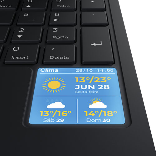 Além disso, o software proprietário da Positivo permite configurá-la para exibir previsão do tempo, lembretes pessoais, status do dispositivo (bateria, rede, conexões), além de fotos e GIFs. O controle é feito de forma prática por meio de uma tecla dedicada, que permite navegar pelas páginas da Minitela com agilidade.