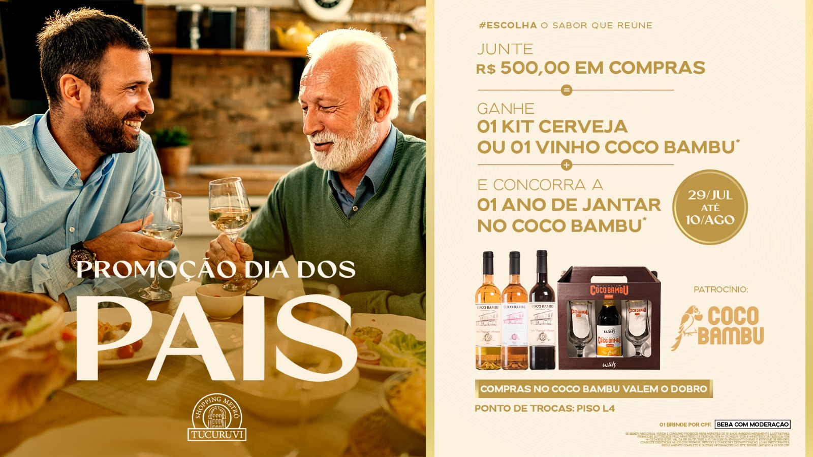 A ação acontece entre os dias 29 de julho e 10 de agosto e promete tornar a data ainda mais memorável para toda a família. Durante o período, os participantes que acumularem R$ 500 em compras poderão escolher entre dois brindes: um kit cerveja ou uma unidade de vinho do restaurante Coco Bambu.