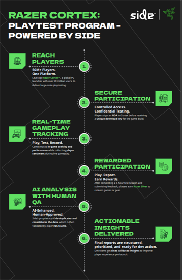 O programa Razer Cortex Playtest Powered by Side combina recursos tradicionais de testes de jogabilidade com QA em larga escala, e é a primeira solução completa do mercado com foco em desenvolvedores que buscam feedback técnico e qualitativo.