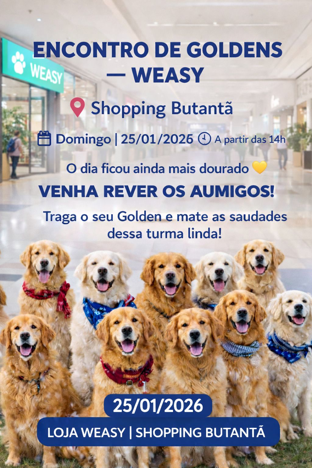 A Weasy, marca brasileira reconhecida por desenvolver soluções inteligentes, sustentáveis e funcionais para o bem-estar de cães e gatos, recebe no dia 25 de janeiro, a partir das 14h, tutores e seus golden retrievers para o Encontro de Goldens Weasy primeira reuniAU do ano em sua loja física inaugurada no Shopping Butantã, em São Paulo.